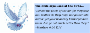 Matthew 6:22-26 — “Behold the fowls of the air.” The passage emphasizes that God provides for all creatures, and if He cares for the birds, how much more will He care for us? It is a reminder not to worry excessively about our needs, as God knows what we require and will provide for us. CLICK HERE for our special Summer Series — Blessings from the Bible.